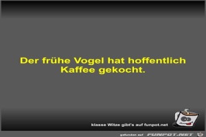 | Der frühe Vogel hat hoffentlich Kaffee gekocht Bild (17.84 KB) von Fossy am 08. März 2024 um 14:07 Uhr Lustiges → klasse Sprüche und Witze | Lustiges → klasse Sprüche und Witze | 08.03.24-14:07 | Fossy | ||