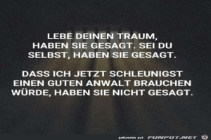 | Lebe deinen Traum Bild (86.5 KB) 1Lustiges → klasse Sprüche und Witze | Lustiges → klasse Sprüche und Witze | 29.02.24-08:28 | ||