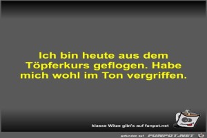 | Ich bin heute aus dem Töpferkurs geflogen Bild (23.81 KB) 3Lustiges → klasse Sprüche und Witze | Lustiges → klasse Sprüche und Witze | 15.01.24-11:29 | Fossy | |