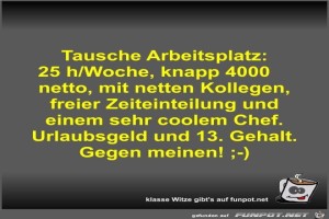 | Tausche Arbeitsplatz Bild (41.81 KB) 3Lustiges → klasse Sprüche und Witze | Lustiges → klasse Sprüche und Witze | 12.01.24-13:01 | Fossy | |