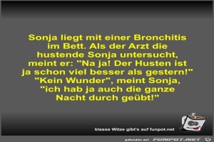 | Sonja liegt mit einer Bronchitis im Bett Bild (41.32 KB) 2Lustiges → klasse Sprüche und Witze | Lustiges → klasse Sprüche und Witze | 13.01.24-17:39 | Fossy | |