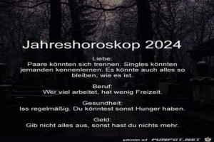 | Jahreshoroskop 2024 Bild (77.96 KB) 8Lustiges → klasse Sprüche und Witze | Lustiges → klasse Sprüche und Witze | 02.01.24-07:54 | Pfahl | |