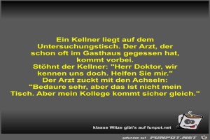| Ein Kellner liegt auf dem Untersuchungstisch Bild (40.25 KB) 3Lustiges → klasse Sprüche und Witze | Lustiges → klasse Sprüche und Witze | 21.12.23-10:15 | Fossy | |