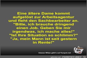 | Eine ältere Dame kommt aufgelöst zur Arbeitsagentur und... Bild (45.51 KB) 12Lustiges → klasse Sprüche und Witze | Lustiges → klasse Sprüche und Witze | 21.12.23-13:12 | Fossy | |