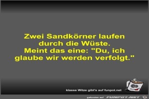 | Zwei Sandkörner laufen durch die Wüste Bild (26.98 KB) 3Lustiges → klasse Sprüche und Witze | Lustiges → klasse Sprüche und Witze | 22.12.23-13:19 | Fossy | |