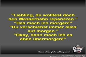 | Liebling, du wolltest doch den Wasserhahn reparieren Bild (38.59 KB) 5Lustiges → klasse Sprüche und Witze | Lustiges → klasse Sprüche und Witze | 06.12.23-10:10 | Fossy | |