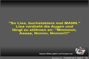 | So Lisa, buchstabiere mal MANN Bild (25.56 KB) 1Lustiges → klasse Sprüche und Witze | Lustiges → klasse Sprüche und Witze | 05.12.23-13:05 | Fossy | |