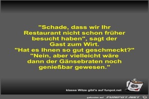 | Schade, dass wir Ihr Restaurant nicht schon früher besucht Bild (36.87 KB) 6Lustiges → klasse Sprüche und Witze | Lustiges → klasse Sprüche und Witze | 05.12.23-10:05 | Fossy | |