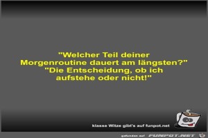 | Welcher Teil deiner Morgenroutine dauert am längsten? Bild (22.78 KB) 4Lustiges → klasse Sprüche und Witze | Lustiges → klasse Sprüche und Witze | 06.12.23-13:29 | Fossy | |
