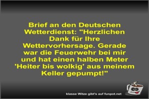 | Brief an den Deutschen Wetterdienst Bild (40.53 KB) 4Lustiges → klasse Sprüche und Witze | Lustiges → klasse Sprüche und Witze | 27.07.-19:22 | Fossy | |