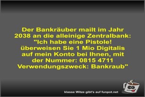 | Der Bankräuber mailt im Jahr 2038 an die alleinige... Bild (38.84 KB) von Fossy am 28. Juli 2025 um 17:18 Uhr Lustiges → klasse Sprüche und Witze | Lustiges → klasse Sprüche und Witze | 28.07.-17:18 | Fossy | ||
