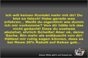 | Ich will keinen Kontakt mehr mit dir! Du bist so falsch!... Bild (53.78 KB) 1Lustiges → klasse Sprüche und Witze | Lustiges → klasse Sprüche und Witze | 28.07.-12:21 | Fossy | |