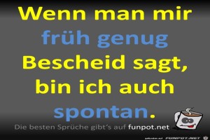 | Spontan sein Bild (72.14 KB) 9Lustiges → klasse Sprüche und Witze Dann kann jeder spontan sein, wenn man früh genug Bescheid bekommt ;-) | Lustiges → klasse Sprüche und Witze | 04.10.23-10:42 | Fossy | |
