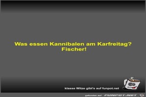 | Was essen Kannibalen am Karfreitag? Bild (14.88 KB) 2Lustiges → klasse Sprüche und Witze | Lustiges → klasse Sprüche und Witze | 05.10.23-10:34 | Fossy | |