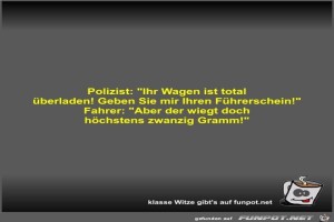 | Polizist: Ihr Wagen ist total überladen! Geben Sie mir... Bild (21.87 KB) 6Lustiges → klasse Sprüche und Witze | Lustiges → klasse Sprüche und Witze | 05.10.23-19:22 | Fossy | |