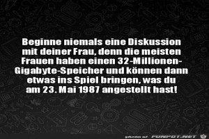 | Nie mit einer Frau diskutieren Bild (104.28 KB) 14Lustiges → klasse Sprüche und Witze | Lustiges → klasse Sprüche und Witze | 04.10.23-18:04 | ||