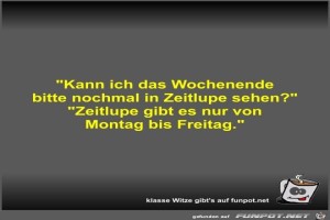| Kann ich das Wochenende bitte nochmal in Zeitlupe sehen? Bild (25.88 KB) 3Lustiges → klasse Sprüche und Witze | Lustiges → klasse Sprüche und Witze | 04.10.23-14:03 | Fossy | |
