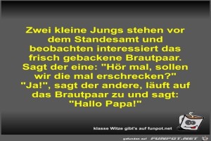 | Zwei kleine Jungs stehen vor dem Standesamt und beobachten Bild (47.89 KB) 1Lustiges → klasse Sprüche und Witze | Lustiges → klasse Sprüche und Witze | 02.10.23-18:25 | Fossy | |
