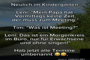 | Kindergarten-Weisheit: Meeting erklärt! Bild (126.43 KB) 4Lustiges → klasse Sprüche und Witze | Lustiges → klasse Sprüche und Witze | 26.07.-16:37 | Samu51 | |