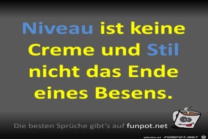 | Niveau und Stil Bild (67.52 KB) 8Lustiges → klasse Sprüche und Witze Könnte ja gut sein, dass jemand Niveau mit Nivea verwechselt ;-) | Lustiges → klasse Sprüche und Witze | 27.09.23-15:16 | Fossy | |