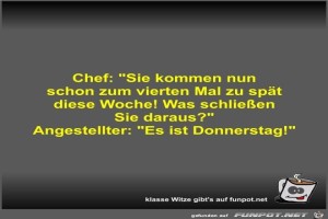 | Chef: Sie kommen nun schon zum vierten Mal zu spät diese... Bild (28.61 KB) 3Lustiges → klasse Sprüche und Witze | Lustiges → klasse Sprüche und Witze | 27.09.23-13:59 | Fossy | |