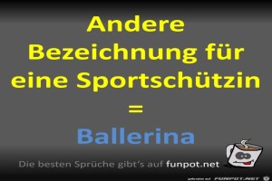 | Ballerina Bild (63.96 KB) 5Lustiges → klasse Sprüche und Witze Mit einer Ballerina hat die Sportschützin allerdings sowas von gar nichts zu tun. Aber der Wortwitz passt auf jeden Fall ;-) | Lustiges → klasse Sprüche und Witze | 12.09.23-10:40 | Fossy | |
