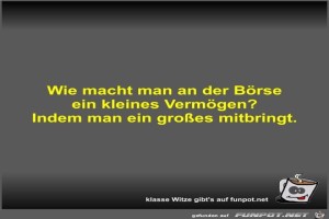 | Wie macht man an der Börse ein kleines Vermögen? Bild (23.26 KB) 2Lustiges → klasse Sprüche und Witze | Lustiges → klasse Sprüche und Witze | 14.09.23-11:29 | Fossy | |
