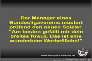 | Der Manager eines Bundesligavereins mustert prüfend den... Bild (39.53 KB) 2Lustiges → klasse Sprüche und Witze | Lustiges → klasse Sprüche und Witze | 07.09.23-17:15 | Fossy | |
