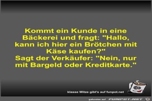 | Kommt ein Kunde in eine Bäckerei und fragt Bild (35.74 KB) 4Lustiges → klasse Sprüche und Witze | Lustiges → klasse Sprüche und Witze | 29.08.23-10:30 | Fossy | |