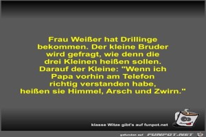 | Frau Weißer hat Drillinge bekommen Bild (37.15 KB) 4Lustiges → klasse Sprüche und Witze | Lustiges → klasse Sprüche und Witze | 18.08.23-18:06 | Fossy | |