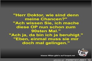 | Herr Doktor, wie sind denn meine Chancen? Bild (39.68 KB) 1Lustiges → klasse Sprüche und Witze | Lustiges → klasse Sprüche und Witze | 16.08.23-09:37 | Fossy | |