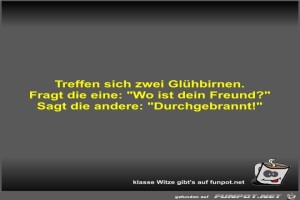| Treffen sich zwei Glühbirnen Bild (22.88 KB) 4Lustiges → klasse Sprüche und Witze | Lustiges → klasse Sprüche und Witze | 15.08.23-19:14 | Fossy | |