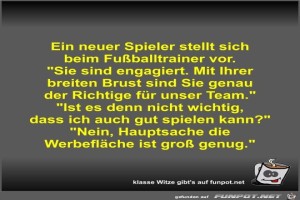 | Ein neuer Spieler stellt sich beim Fußballtrainer vor Bild (45.57 KB) 1Lustiges → klasse Sprüche und Witze | Lustiges → klasse Sprüche und Witze | 18.08.23-14:18 | Fossy | |