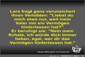 | Lara fragt ganz verunsichert ihren Verlobten Bild (47.6 KB) 3Lustiges → klasse Sprüche und Witze | Lustiges → klasse Sprüche und Witze | 15.08.23-11:26 | Fossy | |