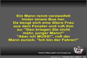 | Ein Mann rennt verzweifelt hinter einem Bus her Bild (39.22 KB) 3Lustiges → klasse Sprüche und Witze | Lustiges → klasse Sprüche und Witze | 16.08.23-12:37 | Fossy | |