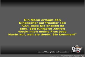 | Ein Mann ertappt den Einbrecher auf frischer Tat Bild (29.27 KB) 1Lustiges → klasse Sprüche und Witze | Lustiges → klasse Sprüche und Witze | 12.08.23-13:58 | Fossy | |