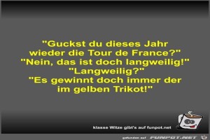 | Guckst du dieses Jahr wieder die Tour de France? Bild (32.9 KB) 2Lustiges → klasse Sprüche und Witze | Lustiges → klasse Sprüche und Witze | 12.08.23-10:54 | Fossy | |