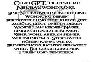 | ChatGPT definiere Neubauwohnung Bild (1.05 MB) 2Lustiges → klasse Sprüche und Witze | Lustiges → klasse Sprüche und Witze | 30.11.-21:32 | Bonobo666 | |