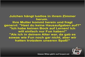 | Julchen hängt lustlos in ihrem Zimmer herum Bild (43.36 KB) 1Lustiges → klasse Sprüche und Witze | Lustiges → klasse Sprüche und Witze | 17.10.-13:31 | Fossy | |