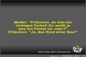 | Mutter: Fritzchen, du bist ein richtiges Ferkel! Du weißt Bild (25.51 KB) 10Lustiges → klasse Sprüche und Witze | Lustiges → klasse Sprüche und Witze | 25.07.23-16:24 | Fossy | |