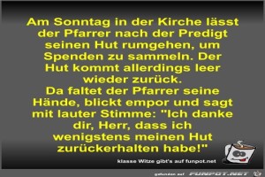 | Am Sonntag in der Kirche lässt der Pfarrer nach der Predigt Bild (56.25 KB) 3Lustiges → klasse Sprüche und Witze | Lustiges → klasse Sprüche und Witze | 22.07.23-13:36 | Fossy | |