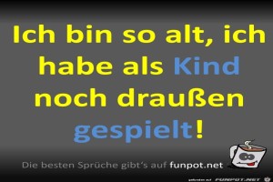 | So alt Bild (67.32 KB) 15Lustiges → klasse Sprüche und Witze Draußen spielen war für uns damals das Allergrößte. Man war wirklich traurig, wenn es dämmerte und man dann nach Hause musste. | Lustiges → klasse Sprüche und Witze | 24.07.23-14:12 | ||