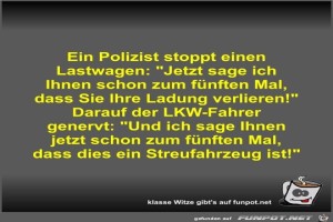 | Ein Polizist stoppt einen Lastwagen Bild (44.98 KB) 3Lustiges → klasse Sprüche und Witze | Lustiges → klasse Sprüche und Witze | 24.07.23-16:58 | Fossy | |