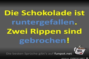 | Schokolade Bild (66.78 KB) 5Lustiges → klasse Sprüche und Witze Bei der Schokolade ist es nicht schlimm, wenn zwei Rippen brechen. Schon ein Grund sie zu essen :-) | Lustiges → klasse Sprüche und Witze | 19.07.23-10:31 | ||