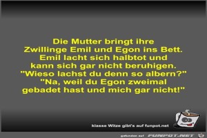 | Die Mutter bringt ihre Zwillinge Emil und Egon ins Bett Bild (38.5 KB) 4Lustiges → klasse Sprüche und Witze | Lustiges → klasse Sprüche und Witze | 21.07.23-18:38 | Fossy | |