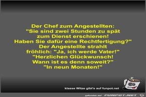 | Der Chef zum Angestellten Bild (39.35 KB) 2Lustiges → klasse Sprüche und Witze | Lustiges → klasse Sprüche und Witze | 19.07.23-13:47 | Fossy | |