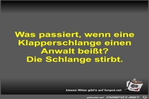 | Was passiert, wenn eine Klapperschlange einen Anwalt beißt? Bild (28.53 KB) 2Lustiges → klasse Sprüche und Witze | Lustiges → klasse Sprüche und Witze | 21.07.23-10:44 | Fossy | |