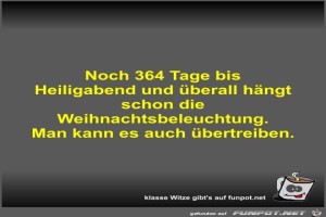 | Noch 364 Tage bis Heiligabend und überall hängt schon die... Bild (28.66 KB) 1Lustiges → klasse Sprüche und Witze | Lustiges → klasse Sprüche und Witze | 16.07.23-18:10 | Fossy | |