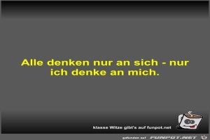 | Alle denken nur an sich - nur ich denke an mich Bild (17.04 KB) 2Lustiges → klasse Sprüche und Witze | Lustiges → klasse Sprüche und Witze | 13.07.23-11:10 | Fossy | |