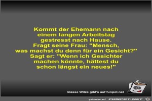 | Kommt der Ehemann nach einem langen Arbeitstag gestresst... Bild (36.55 KB) 4Lustiges → klasse Sprüche und Witze | Lustiges → klasse Sprüche und Witze | 18.06.23-10:05 | Fossy | |